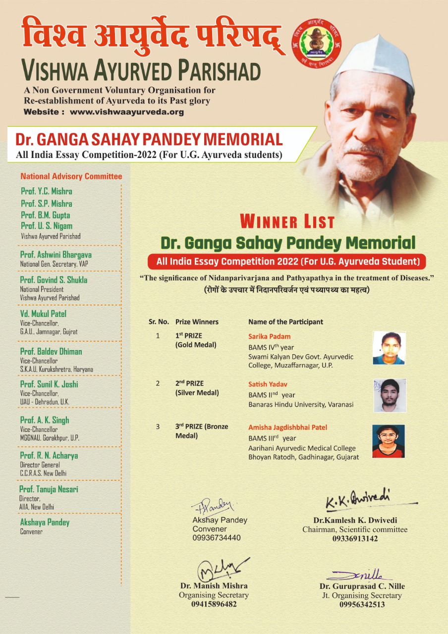 Dr. GANGA SAHAY PANDEY MEMORIAL All India Essay Competition-2024 (For U.G. Ayurveda Students) Results