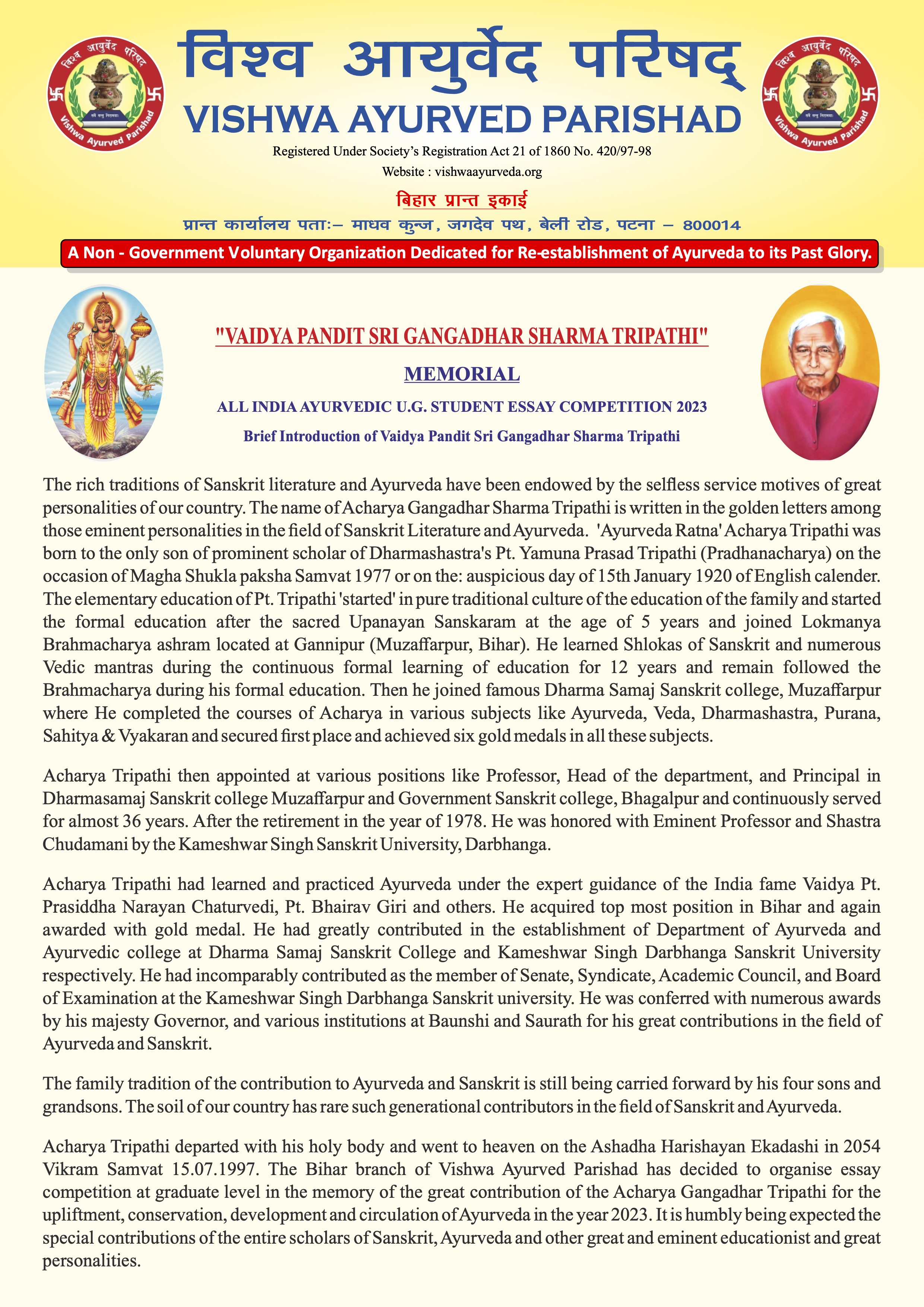 "VAIDYA PANDIT SRI GANGADHAR SHARMA TRIPATHI" memorial Essay Competition 2023