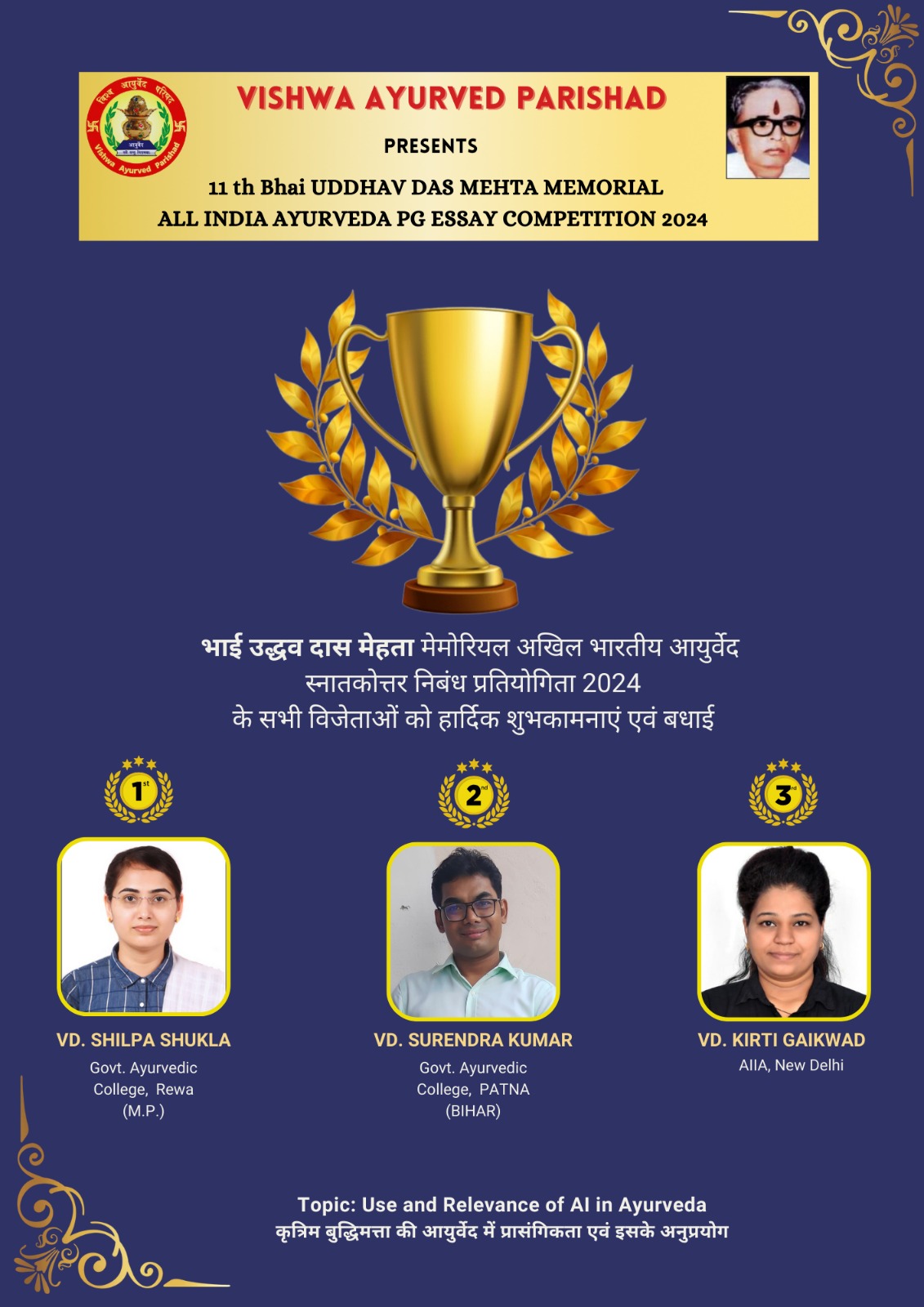 BHAI UDDHAV DAS MEHTA MEMORIAL ALL INDIA AYURVED PG ESSAY COMPETITION 2024- Result