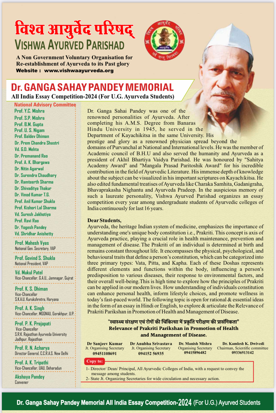 Dr. GANGA SAHAY PANDEY MEMORIAL All India Essay Competition-2024 (For U.G. Ayurveda Students)
